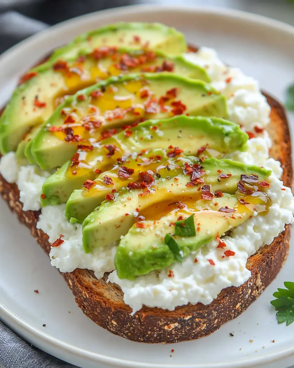 The whole grain bread contributes essential fiber that aids digestion and promotes heart health. Ripe avocados are rich in monounsaturated fats, which are beneficial for heart health and can help lower bad cholesterol levels. Cottage cheese is an excellent source of protein, making this dish an ideal choice for muscle repair and growth. Finally, hot honey not only adds a unique flavor but also contains antioxidants, making each bite a little boost to your immune system.