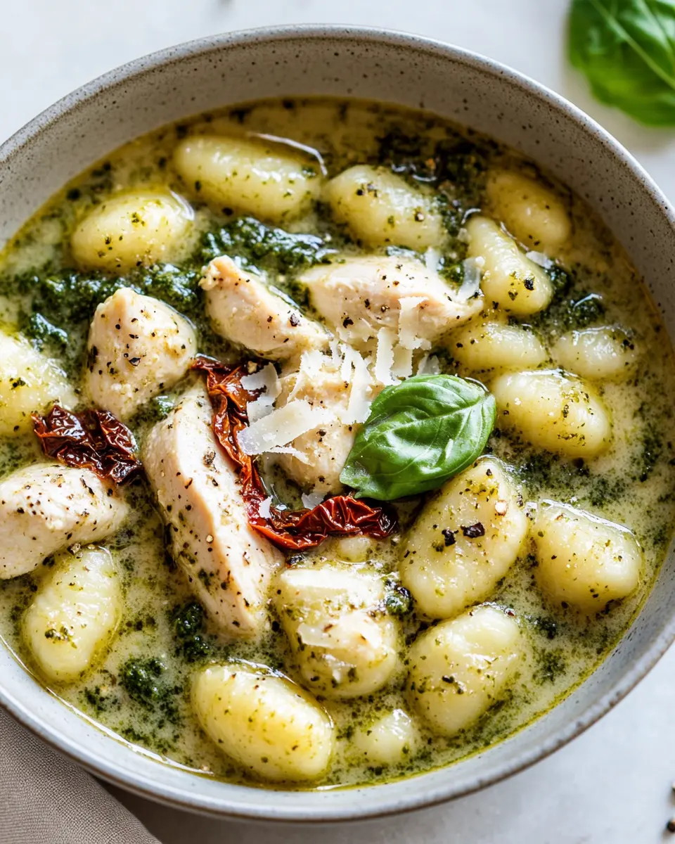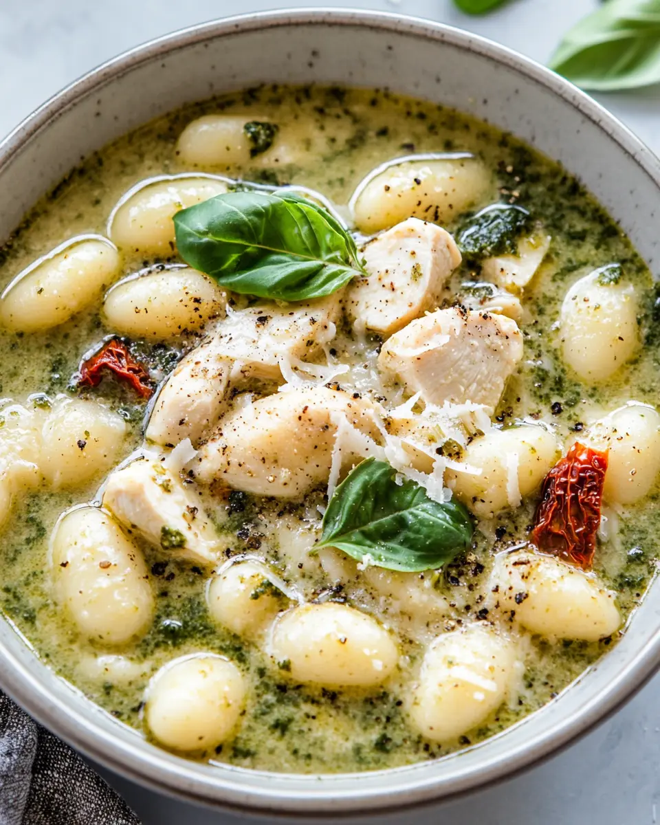A delicious and hearty soup combining tender chicken, flavorful pesto, and soft gnocchi in a savory broth.