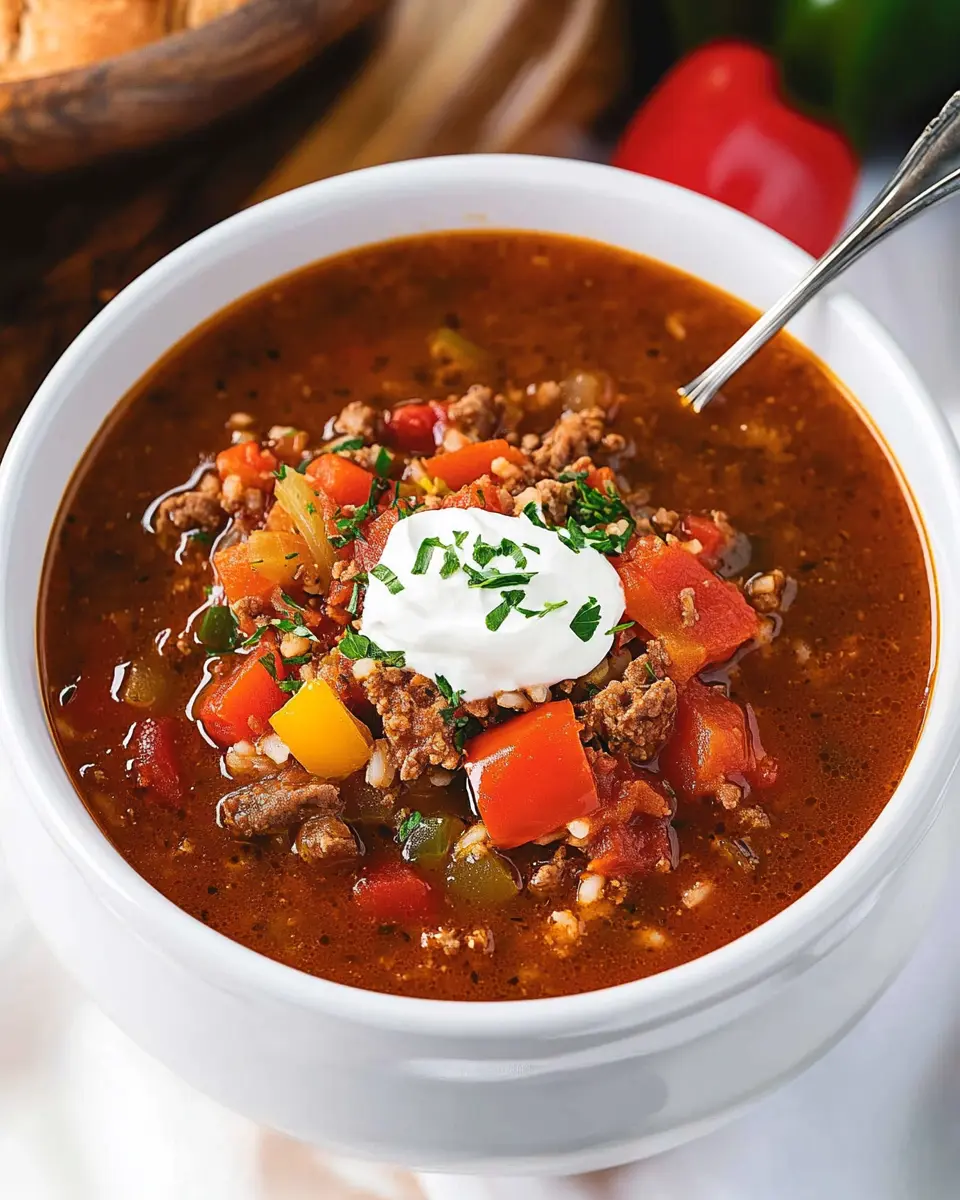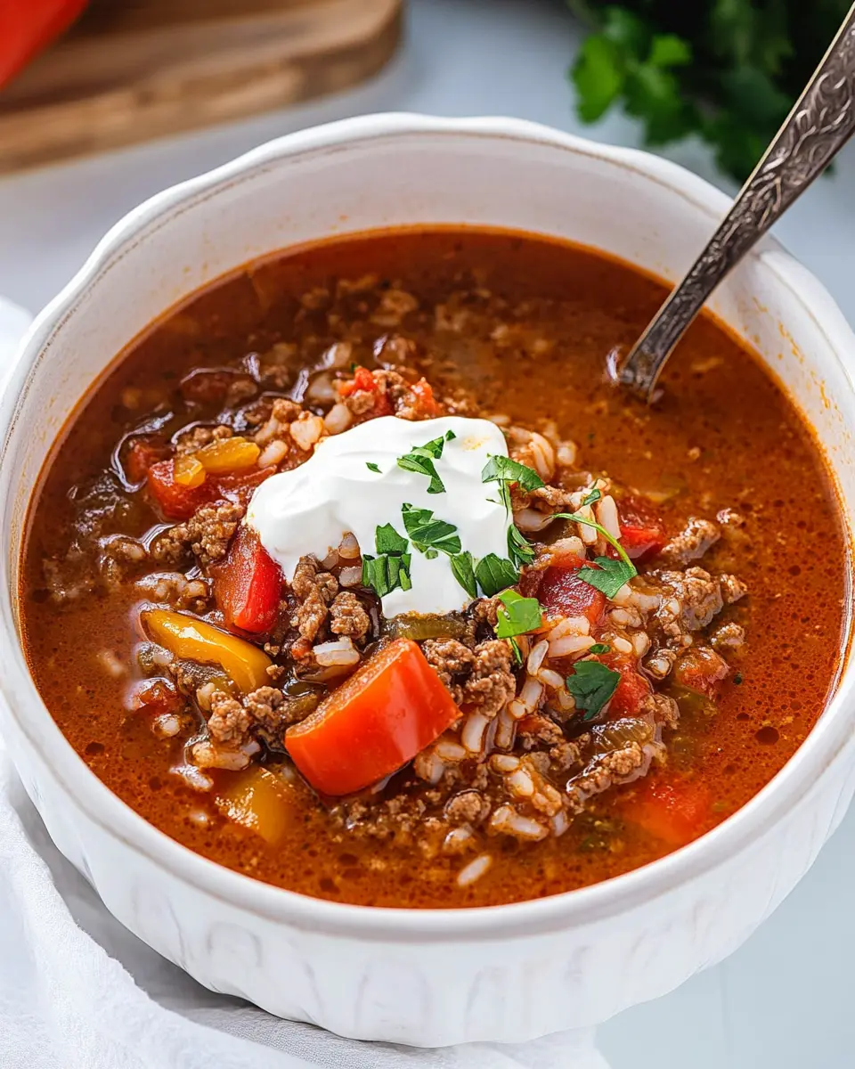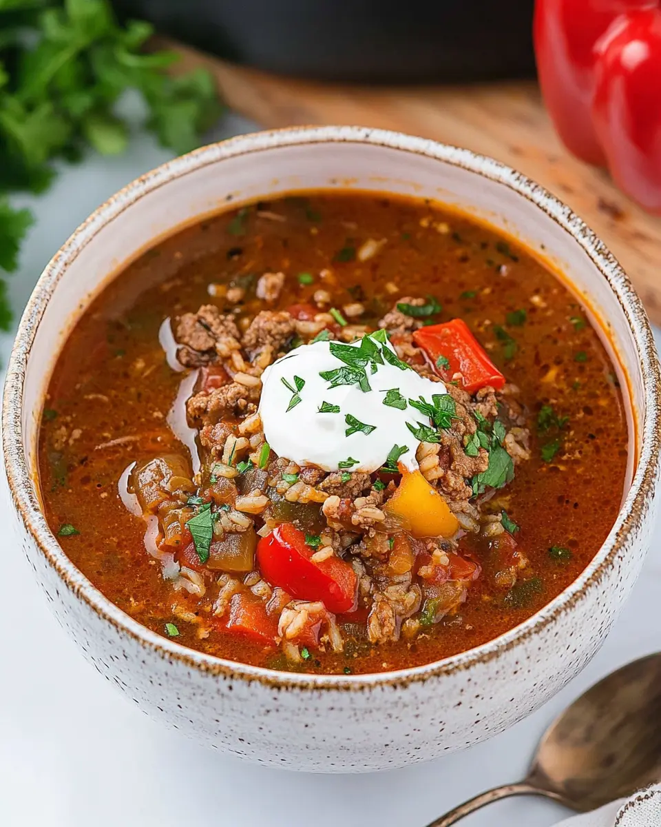 A hearty and comforting soup with all the flavors of stuffed peppers.