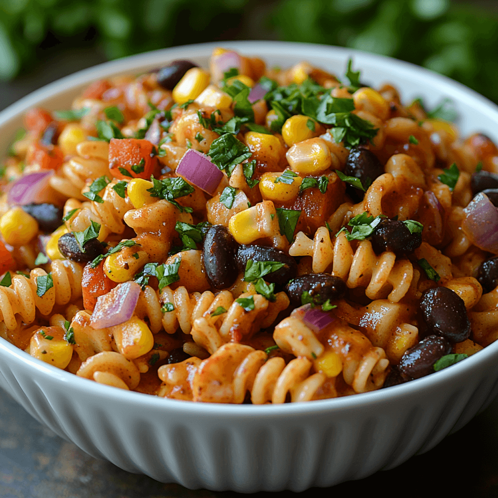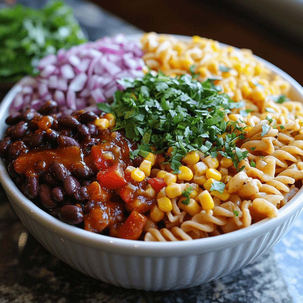 Imagine this: a vibrant mix of perfectly cooked rotini pasta, juicy corn kernels, hearty black beans, crisp red bell pepper, and a hint of red onion. All of this is tossed in a dreamy, irresistible sauce that’s both sweet and savory. Then, we add the satisfying sharpness of cheddar cheese, creating a wonderful textural contrast that is simply amazing. The optional cilantro or green onions bring a refreshing lift that ties everything together.