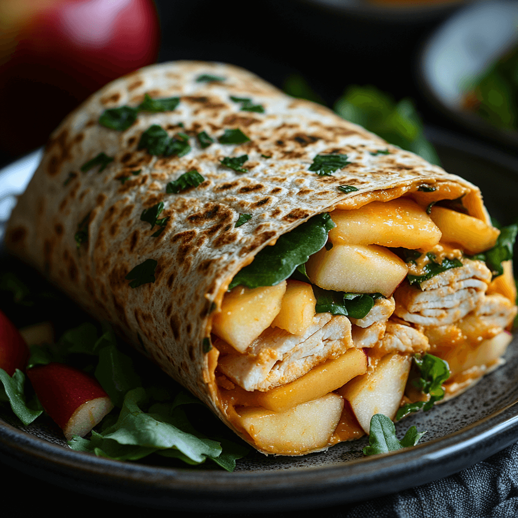 A quick and easy lunch or snack featuring thinly sliced turkey, crisp apple, and sharp cheddar cheese, all wrapped in a warm tortilla.