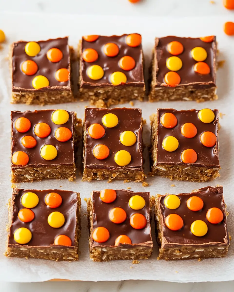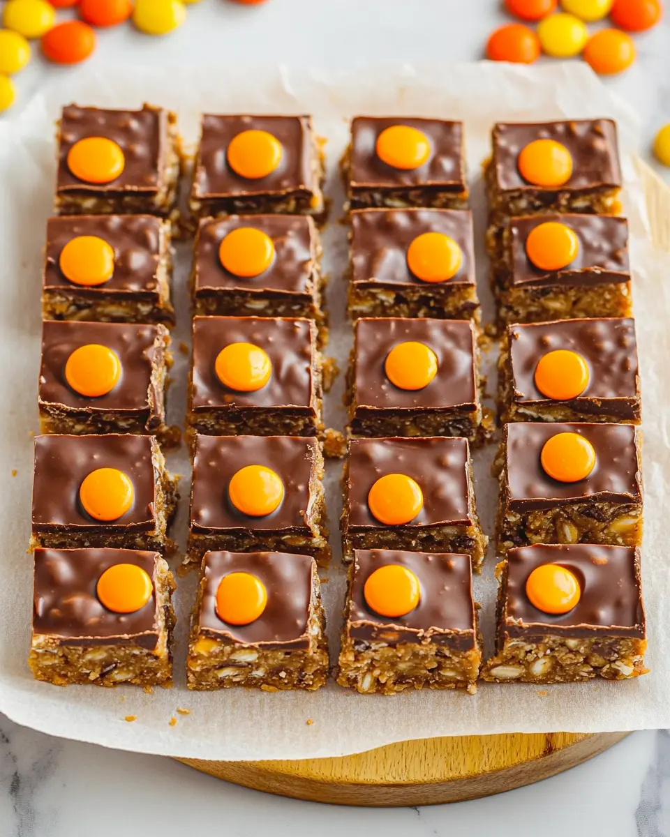 Reese’s Pieces (1/2 cup): Adding a fun and nostalgic crunch, Reese’s Pieces infuse these bars with a sweet flavor that makes healthy snacking enjoyable.